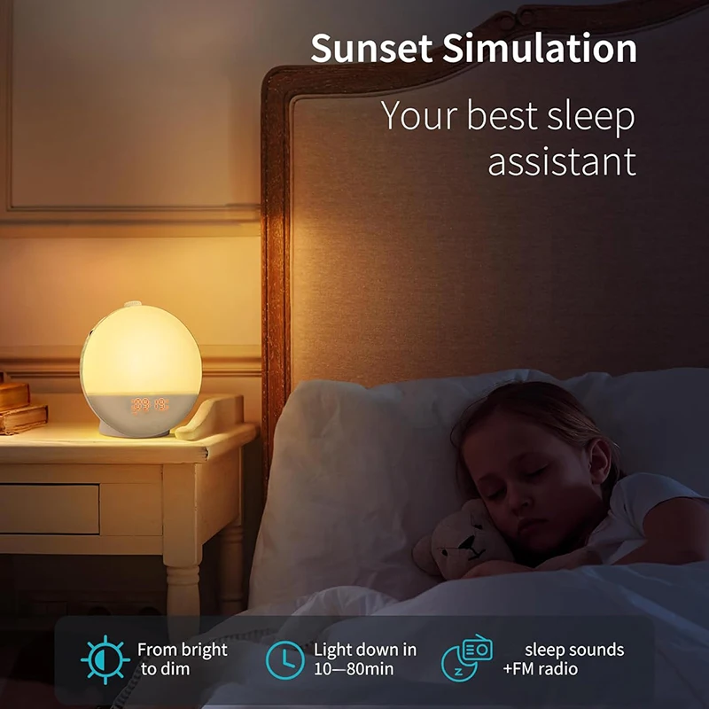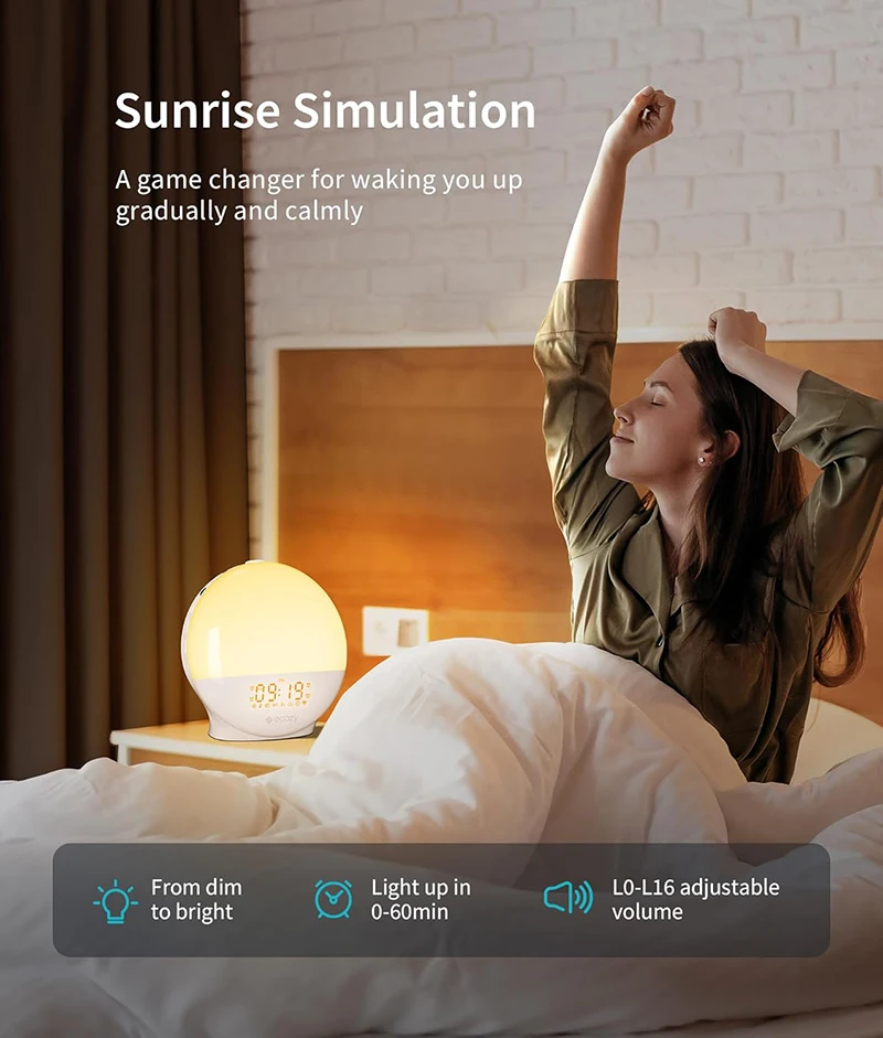 1Gentle Sunrise Wake-Up: Simulate natural dawn with light gradually brightening from 10% to 100% over 30 minutes before alarm time, paired with 7 natural sounds for a peaceful start .